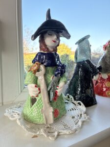And while she was doing so she spotted old Miss Jemima over the boundary ditch working in her old tunnel which had rotting doors falling off their hinges. Little old fat Miss Jemima was a source of endless amusement at coven meetings when she turned up with her hat askew and talk of ancient remedies that no one would dream of using nowadays. “The very woman,” thought Miss Marguerite as she “Yoohoo-ed” her across the ditch, but she got no response. “Darn it, but she has got much deafer lately, lets hope she is not “trine cheile” or even seafoideach as well!” She thought, as she made her way across the grass to where Miss Jemima stood. “Good morning, Miss Jemima, lovely morning, isn’t it, if a bit chilly,” she bellowed into what she thought was the old lady’s good ear,” and the old lady was so surprised she nearly jumped out of her skin and dropped her book and and wooden spoon.
